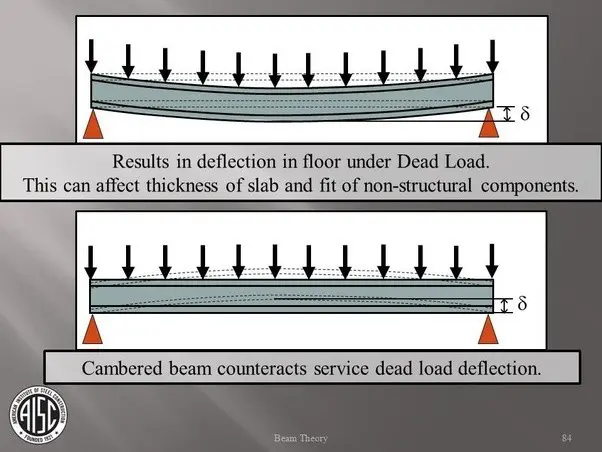 When it comes time to pour concrete on a floor, if beams are not cambered (curved), the floor will permanently sag under the weight. A sagging floor can result in cracking in the bottom of the concrete. When a beam is cambered before adding the concrete, the weight will still sag the floor, but will sag to the point of the floor being leveled.